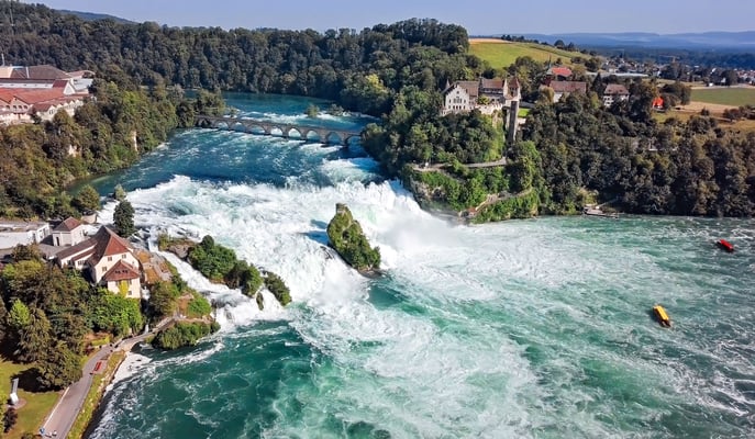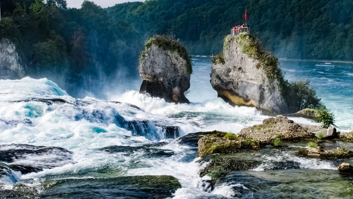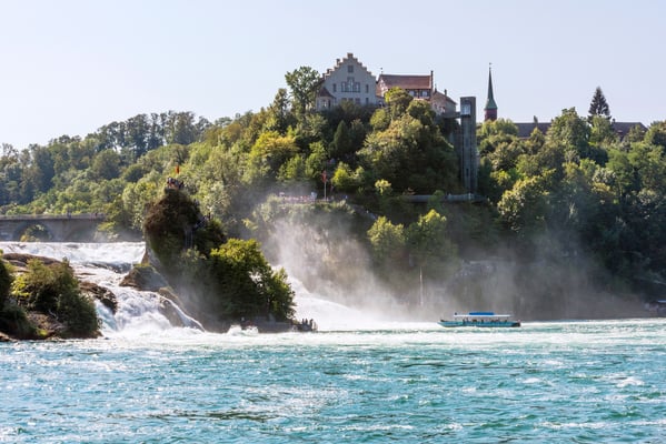 373 mètres cubes d’eau chutent ici à 23 mètres par seconde. Vous avez le choix entre deux plateformes d’observation: une à Neuhausen sur la rive droite, et une autre à Laufen-Uhwiesen, sur la rive gauche. Du côté de Neuhausen, où se trouve le restaurant Schlössli Wörth, vous pouvez prendre le bateau d’excursion jusqu’aux chutes et vous faire déposer au rocher du milieu qui peut être escaladé (attention : escalier raide!). Vous pouvez également prendre le bateau jusqu’au château de Laufen de l’autre côté de la rivière. Au-dessus du Schlössli Wörth, le parc d’aventures Rheinfall offre également une vue exceptionnelle sur le spectacle naturel.