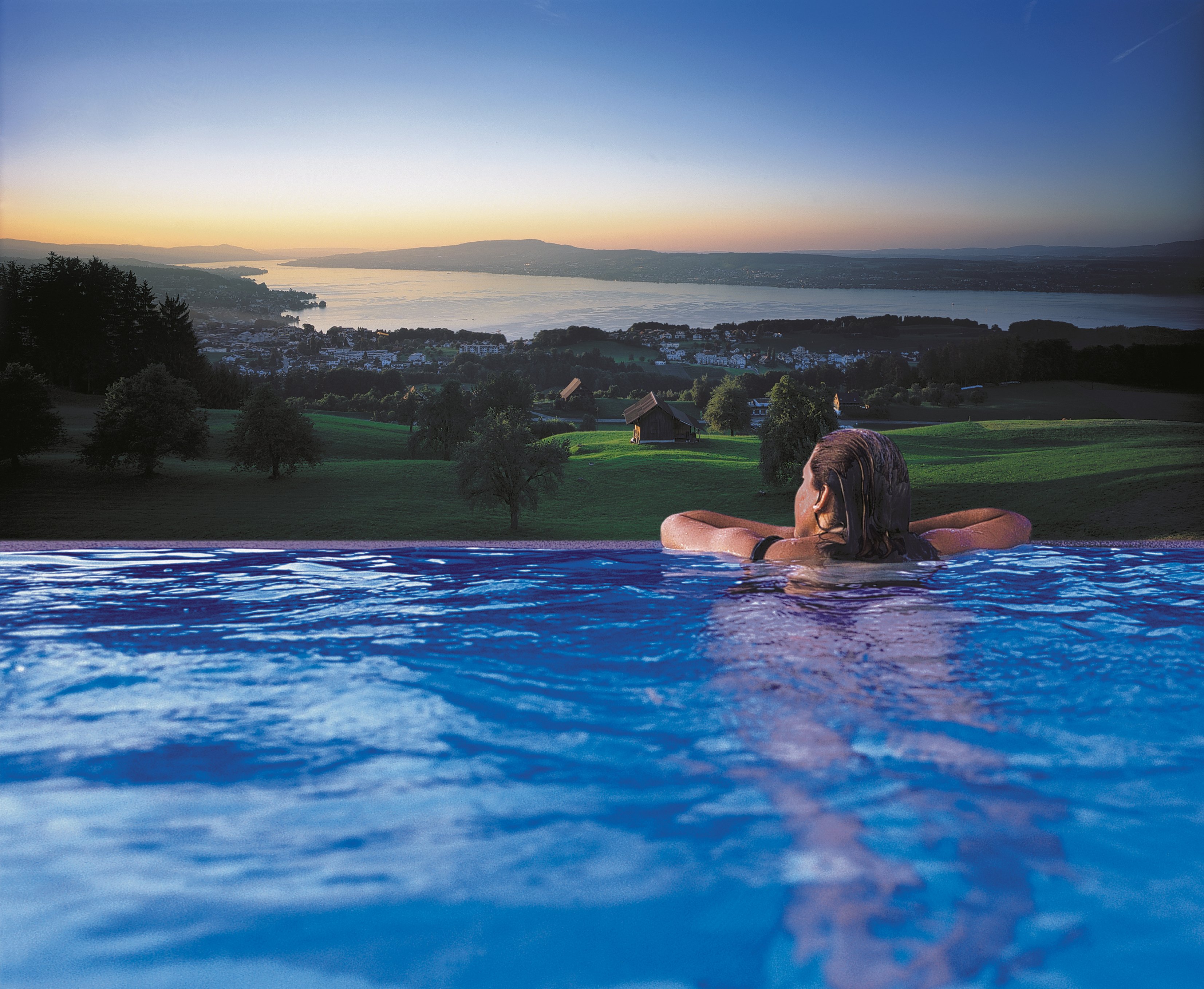 Vicino a Pfäffikon, all‘estremità superiore del lago di Zurigo, si curva un po‘ su per la strada in salita, lontano dal trambusto urbano, le farfalle ronzano a destra e a sinistra su prati e campi di grano, e finalmente: l‘hotel. Le camere, i ristoranti e la spa sono impeccabili ma a rubare la scena è l‘enorme piscina all‘aperto, che sembra galleggiare tra cielo e lago, rivelando una delle viste più spettacolari della Svizzera interna. La famiglia Rüegg si assicura instancabilmente che il suo team faccia tutto alla perfezione, offrendo ottima ospitalità restando umile piuttosto che un servizio con troppe pretese che risulterebbe falso e fuori contesto.