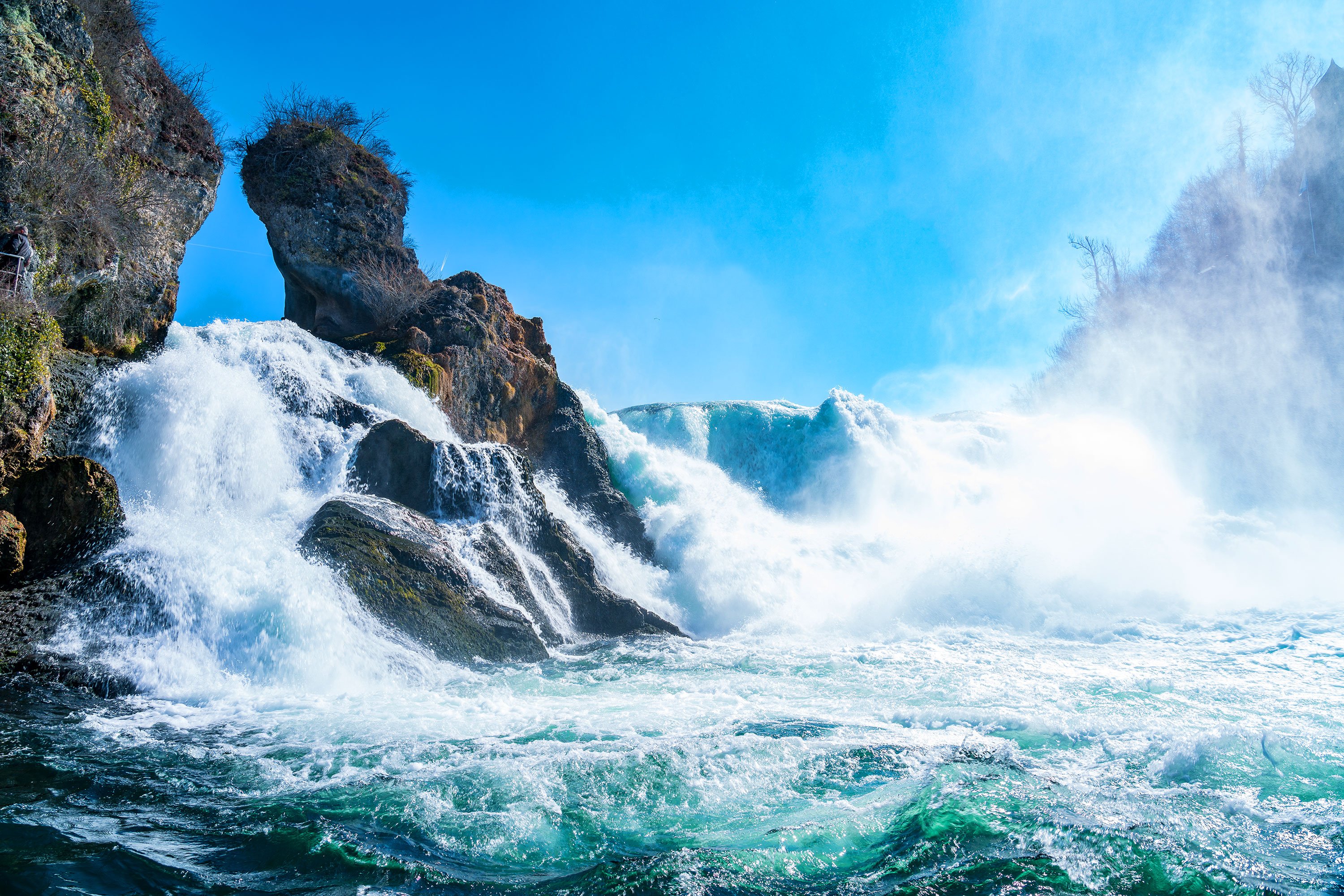 Nei giorni normali, 373 metri cubi d’acqua al secondo possono essere visti ruzzolare per 23 metri nelle profondità. Ci sono piattaforme panoramiche sia a Neuhausen sulla riva destra che a Laufen-Uhwiesen, sulla riva sinistra. Dalla parte di Neuhausen, dove si trova il ristorante Schlössli Wörth, si può prendere una barca e avvicinarsi alle cascate del Reno, larghe 150 metri, essere «scaricati» alla roccia centrale, che può essere scalata tramite ripide scale. Si può anche prendere la barca per Schloss Laufen sull’altro lato del fiume. Il parco avventura delle cascate del Reno sopra Schlössli Wörth offre anche una vista speciale su questo spettacolo della natura.