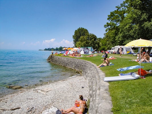 „Pack die Badehose ein, nimm dein kleines Schwesterlein...“ trällerte einst ein Schlagerstar. Passend dazu fühlt sich dieser Naturbadestrand an der Ortsgrenze von Clarens und La-Tour-de-Peilz so an, als wäre dieser irgendwann in den sechziger, siebziger Jahren stehen geblieben. Zum entspannten Retro-Flair mit alten Bäumen passen der Mini-Campingplatz, das Kioskbeizli und die Möglichkeit, nach dem Feierabendschwumm ein Steak am Feuer zu grillen. Nichts stört die Idylle, und wenn die Sonne über dem Lac Léman untergeht, ist das Ferienfeeling perfekt. Hat das Wetter schlechte Laune, bietet die Wassererlebniswelt Aquaparc in Le Bouveret Spass und Action für die ganze Familie. Dazu gehören rasante Rutschpartien von insgesamt einem Kilometer Länge.