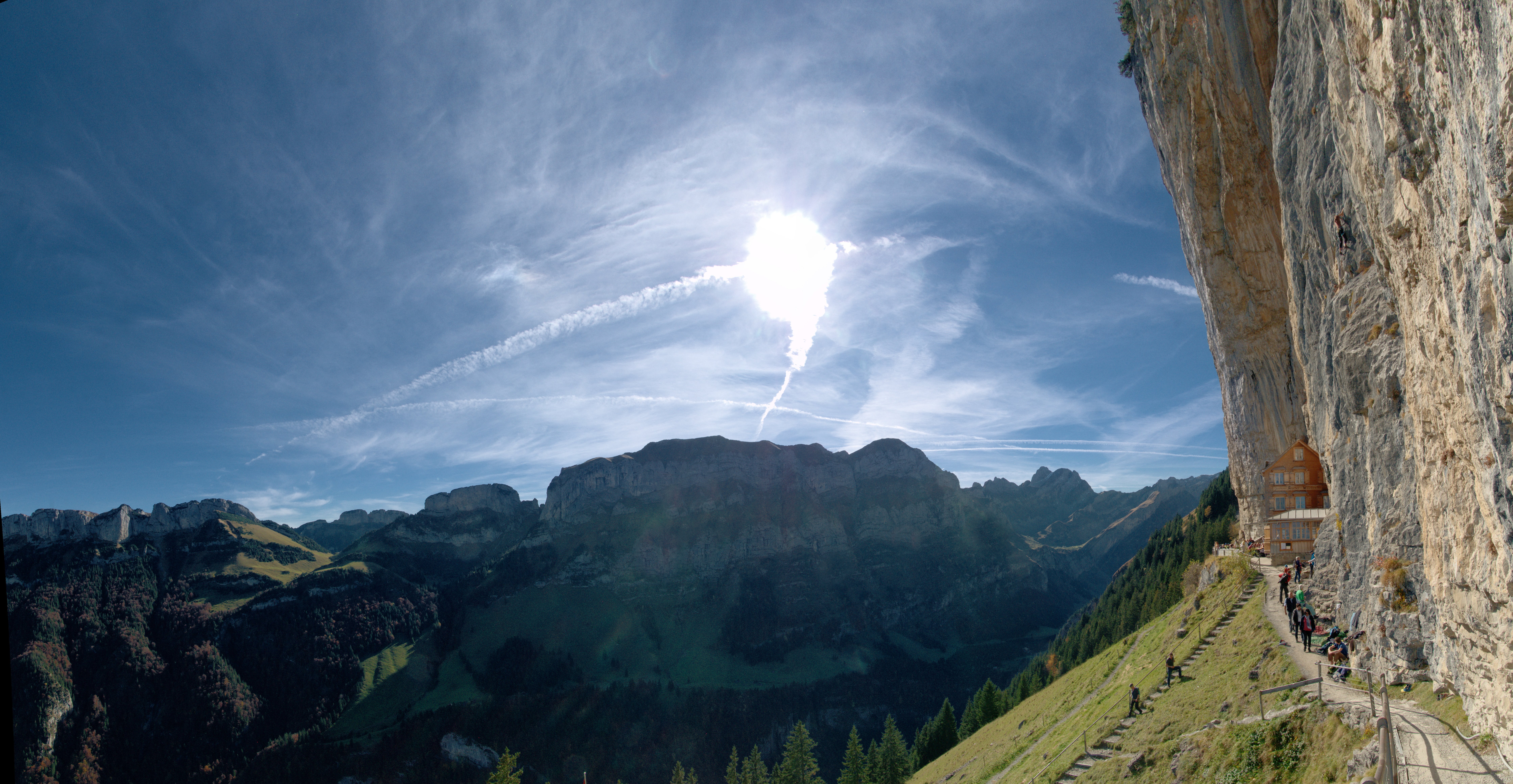 Ein dichtes Wanderwegnetz durchzieht das Appenzellerland und insbesondere das Alpsteingebiet. Per Luftseilbahn geht es ab Wasserauen auf das Hochplateau der Ebenalp (1644 m) und von dort in 15 Gehminuten durch eine zunächst liebliche Landschaft und zwei Höhlen zum Wildkirchli, das sich dramatisch an den Berg krallt. Noch spektakulärer ist die Lage des waghalsig an den Felsen gebauten „Berggasthaus Aescher“, tausendfach abgebildet auf Postkarten und immer einen Besuch wert.