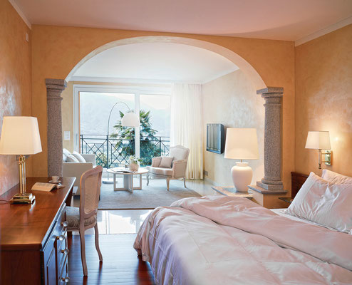 Durch seine grandiose Lage inmitten des eigenen Landwirtschaftsbetriebs im Maggiadelta ist das „Sonnenschloss“ der Welt entrückt. Es hat den grössten Luxus überhaupt zu bieten, nämlich unendlich viel Platz. Der Hotelpark ist wie ein Wohnzimmer im Freien, mit Ecken zum Lesen, Essen, Arbeiten, Spielen, Entspannen. Jeder Gast findet genug Raum für sich und vor allem sein ganz individuelles Lieblingsplätzchen – sei es in einem Lounge-Sofa unter hundertjährigen Bäumen, am privaten Badestrand oder auf seiner eigenen Terrasse. Die Suiten in den beiden Pavillons links und rechts des Hauptgebäudes verfügen über überdachte Loggias mit Blick auf die südliche Traumlandschaft.