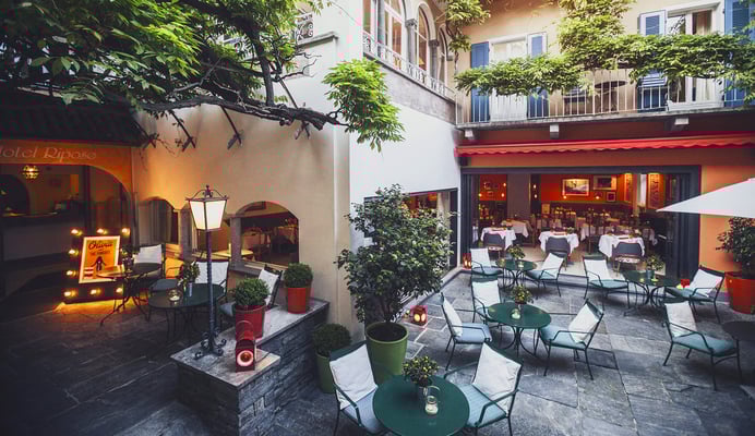 Gewachsen aus einem Tessinerhaus, ist das „Riposo“ ein sympathisch bodenständiges und hervorragend geführtes Dreisternehotel mit grosser Liebe zum Detail. Im Sommer werden die Restaurantgäste je nach Tag entweder im pittoresken Innenhof der Trattoria „Cortile dei Beati“ bewirtet oder auf der Panorama-Dachterrasse mit Blick auf den Lago Maggiore und über die Dächer von Ascona empfangen. Eine Besonderheit sind die fast schon legendären Jazzkonzerte im Innenhof, wo jeden Samstagabend die Familienband um die talentierte Sängerin Olivia Studer und deren Musikfreunde mit coolen und heissen Rhythmen aufspielt.