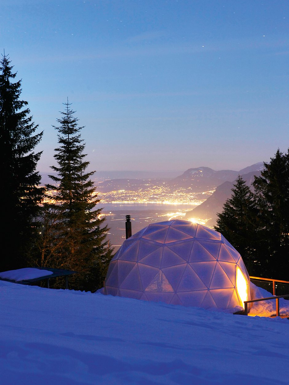 Eskimos in den Walliser Alpen? Nein: Ein einzigartiges Konzept mit fünfzehn geräumigen High-Tech-Zelten – sogenannten „Pods“ –, die ein unvergleichliches Naturerlebnis hoch über dem Genfersee bieten. Jedes Pod ist mit Schwedenofen, Badezimmer, Teeküche und eigener Terrasse ausgestattet. Zum Öko-Alpincamp gehören sieben Kilometer private Skipisten sowie ein Chalet, das Restaurant, Bar und einen kleinen Wellnessbereich mit japanischem Bad und finnischer Sauna beherbergt. Highlights für Freizeitabenteurer sind die Hundeschlittenfahrten und die geführten Schneeschuhtouren.