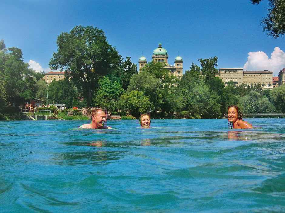 Im Sommer rettet ein Bad in der kühl, grün und träg dahinziehenden Aare den heissesten Tag. Ein ganz besonderes Vergnügen bereitet es, vom Marzilibad an der Aare entlang nach Süden zu spazieren, bis zum Campingplatz Eichholz, sich dort ins Wasser zu stürzen und zum Marzilibad zurücktreiben zu lassen.