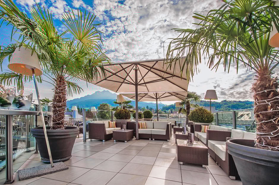 Das «Penthouse» mit Innen- und Aussenbereich war der Pionier der Rooftop-Bars in der Schweiz. Auf der achten Etage des Hotels Astoria gelegen, ist die Dachterrasse ein Highlight der Leuchtenstadt. Auf bequemen Sofas geniesst man einen «Penthouse Special» aus Tequila, Charleston-Liqueur, White Peach und Passionsfruchtsaft sowie Tuna Tataki mit Ponzu beim Sonnenuntergang. Am späteren Abend wird die Musik lauter, und die Gäste konzentrieren sich weniger auf den Ausblick als vielmehr auf die Gesellschaft und das Geschehen. Jedenfalls bekommt man stets das Gefühl, es gelte etwas zu feiern. Für den grösseren Hunger geht’s ins Erd- und Untergeschoss, wo sich «tout Luzern» in den Restaurants «La Cucina» (italienisch), «Mekong» (asiatisch) und «Thai Garden» trifft.